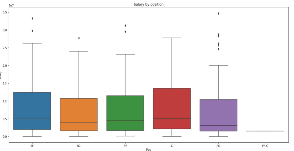 We see here that centers and small forwards have the highest salaries within their interquartile range but the outliers on point guards are more numerous and have a higher maximum. Centers, interestingly, have very few outliers.