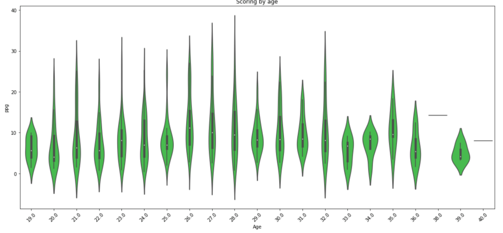 Scoring seems to drop off around 29 years old with a random peak at 32 (weird…).