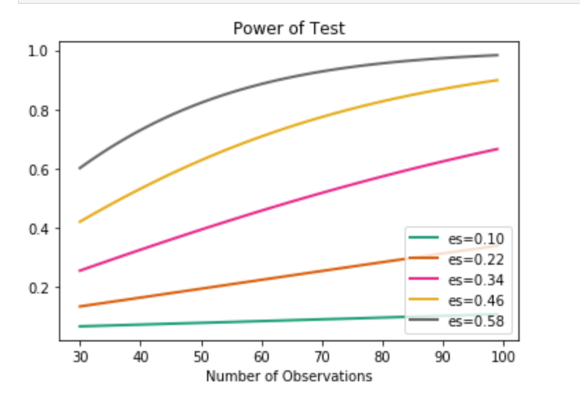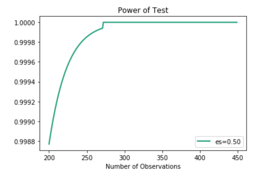 Above, I just showed one curve. As you can see, the effect size is 0.5. In the actual example, however, the effect size is actually much higher. Even with lower effect size, we can see how quickly the power spikes, so I chose to use this visual.
