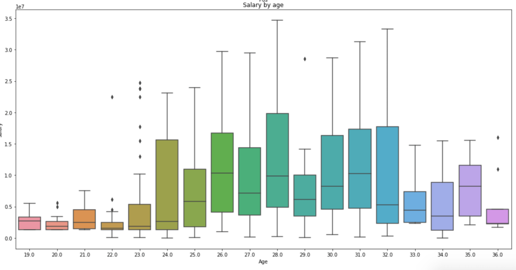 This graph is a little messy so sort it out yourself, but we see that the time players make the most money is between the ages of 24 and 32 on average. Rookie contracts tend to be less lucrative and older players tend to be less relied on, so this visual makes a lot of sense.