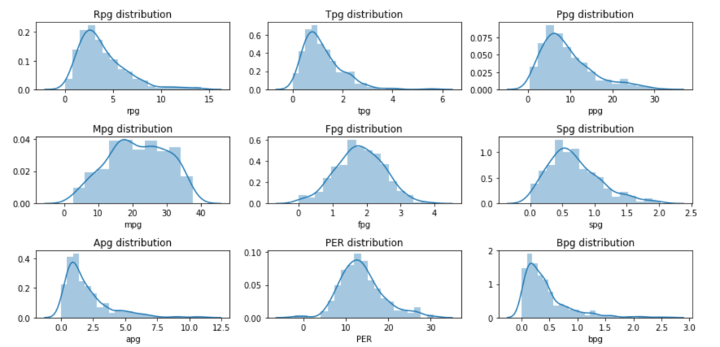 So one of the first things I did here was to generate per game statistics like turning points and games into points per game. Points per games is generally more indicative of scoring ability. Next, I dropped the season totals (in favor of per game statistics) and some other pointless columns. I also created some custom and non-existent stats to see if they would yield any value. An example includes: PER/Games Started – I call this “start efficiency.” Before I dropped more columns to reduce correlation, I did some visual EDA. Let’s talk about that.