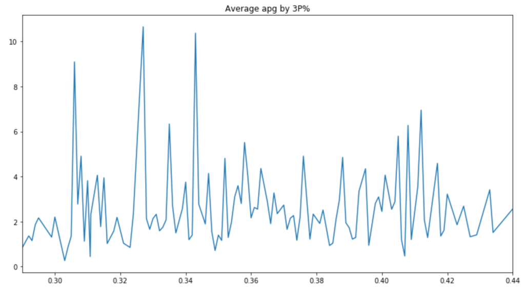 There are a couple peaks, but the graph is pretty messy. Therefore, it is hard to say whether or not players with good 3-Point% get more assists.