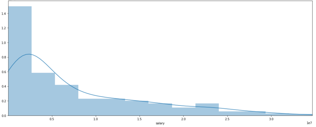 What do we see? Most players don’t make that much money. Some, however, make a lot of money. Interestingly, there is a local peak between x-labels 2 and 2.5. Perhaps this is some representation of the average max salary whereas beyond the salaries get higher but appear far less frequently. That’s just conjecture, keep in mind.